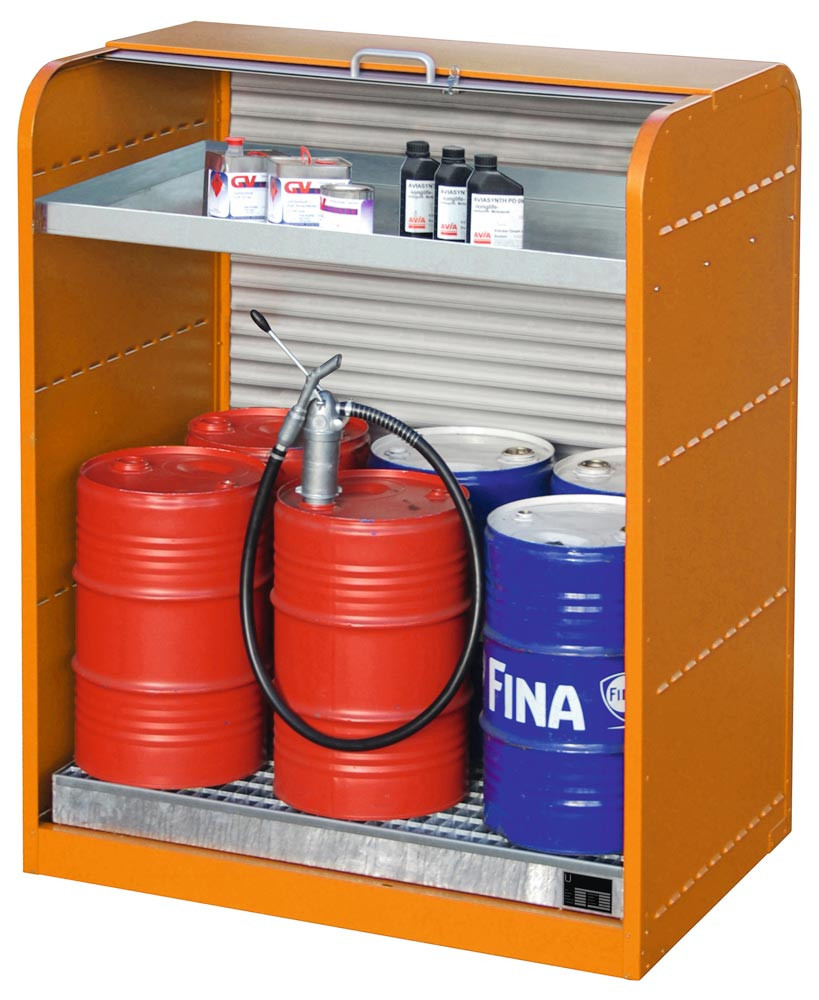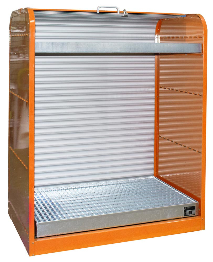 Gefahrstoff-Depot für 6x60-l-Fässer, BxTxH 1300x870x1610 mm, 1 Wanne, 1 Gitterrost, Vol. 73 l, Rolllade, RAL 3000 E1987232