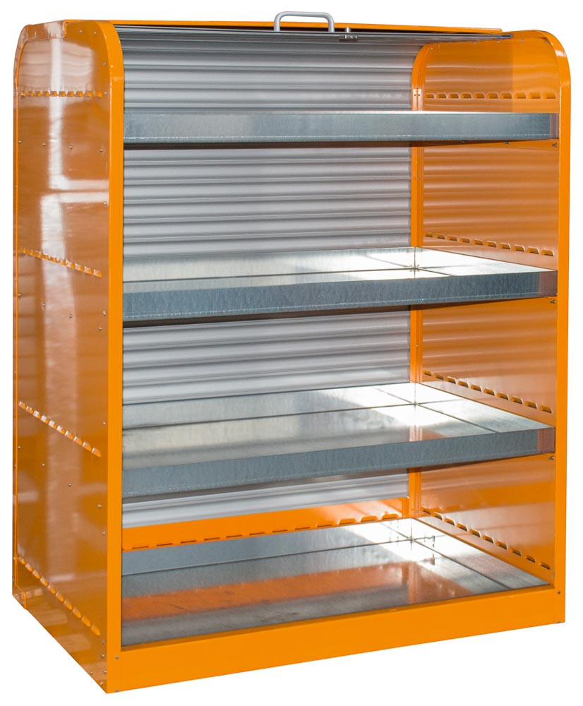 ∙ Mit Alu-Rolllade ∙ Für den Innenbereich bzw. unter Dach ∙ Stabile Konstruktion aus Stahlblech ∙ Natürlicher Luftwechsel ∙ Abschließbar mittels Zylinderschloss ∙ Korpus pulverbeschichtet, Auffangwannen und Gitterroste verzinkt