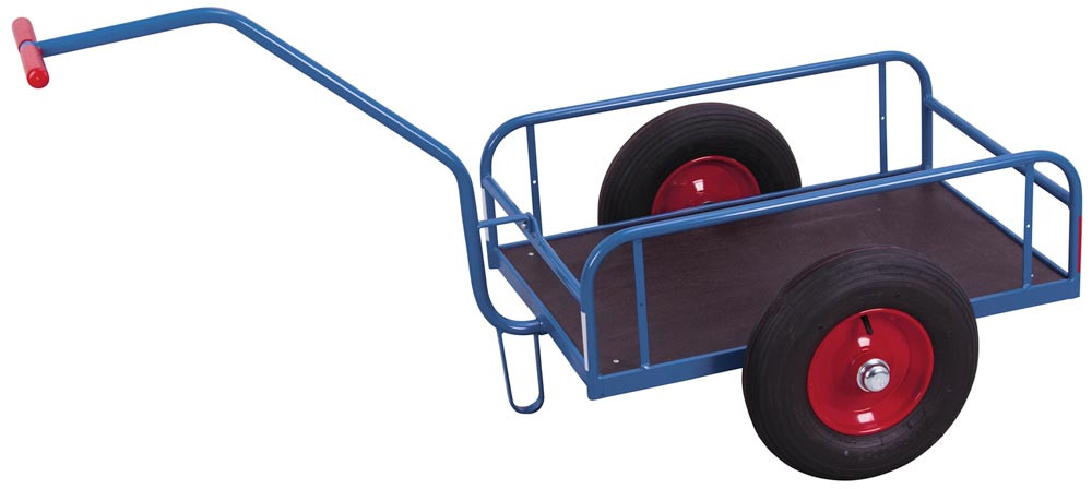 · Geschweißter Profilstahlrahmen · Pulverbeschichtet RAL 5010 enzianblau · Schlag- und kratzfest · Ladefläche mit rutschsicherer Siebdruckplatte aus wasserfest verleimtem Sperrholz · Sicherheitsreflektoren · Geländer- bzw. Bordwandhöhe 220 mm · Handdeichsel · Schutzkappen am Griff · Luftbereifung · Stahlfelge mit Kugellager