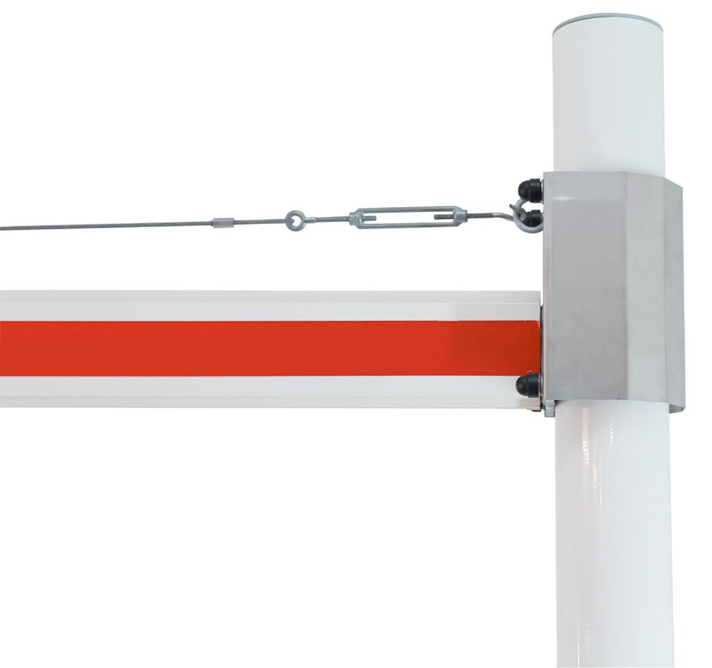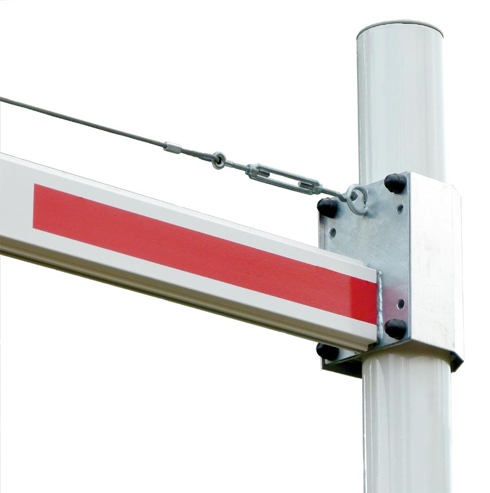 ∙ Mit verstellbarer Durchfahrthöhe bis zu 3,8 m über Flur ∙ Gesamthöhe 4,0 m über Flur ∙ Alle Stahlbauteile feuerverzinkt oder Edelstahl ∙ Pfosten aus Stahlrohr Ø 101,6 x 2,9 mm ∙ Einteiliger Alu-Sperrbalken 86 x 46 mm, mit Schilder- und Werbekulisse ∙ Befestigung durch Aufschrauben der Bodenplatte 250 x 250 mm oder Einbetonieren