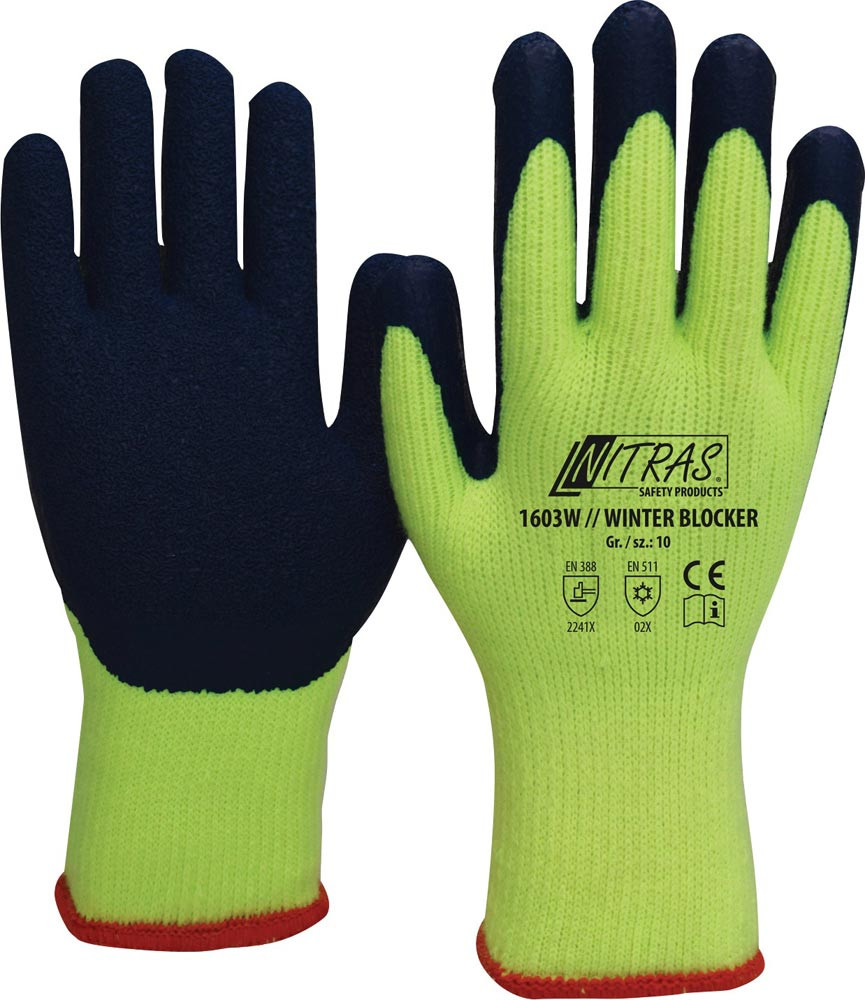nach EN 388 · EN 511 · Kat. II · Material: Baumwoll-Schlingengewebe · gelbe Signalfarbe mit blauer, aufgerauter Latexbeschichtung für maximalen Grip · Anwendung: Kältebereiche im Außenbereich, Winterräumdienste, Kraftfahrer, Kranfahrer, Straßenbau, Kühlgutverteilung