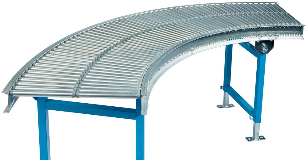 Klein-Rollenbahn mit Stahlrollen, Bahnbreite 300 mm, Achsabstand 25 mm Rollendurchm. 20 mm, Kurve 45 Grad