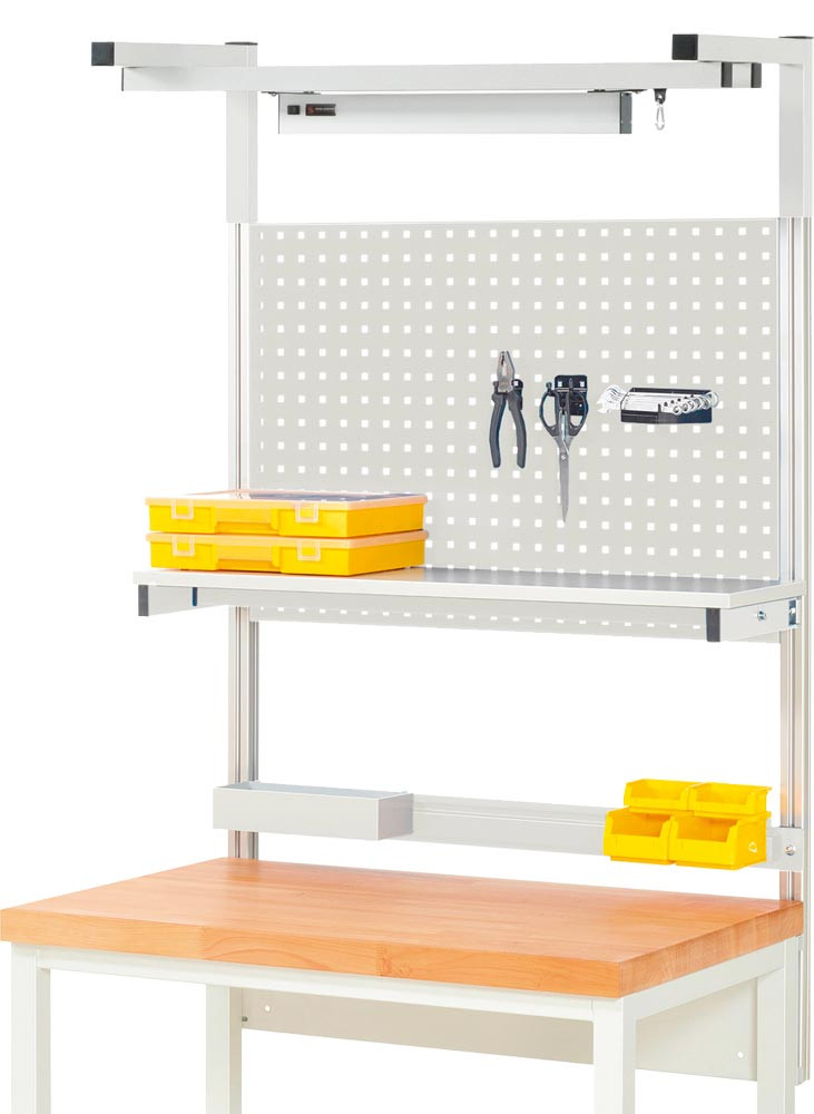 Komplettaufbau für Werkbank B 1250 mm mit Auslegerpaar, 2 x Laufschiene, Laufwagen, LED-Leuchte, Lochplatte H 450mm, Halteschiene, RAL 7035 E6490844