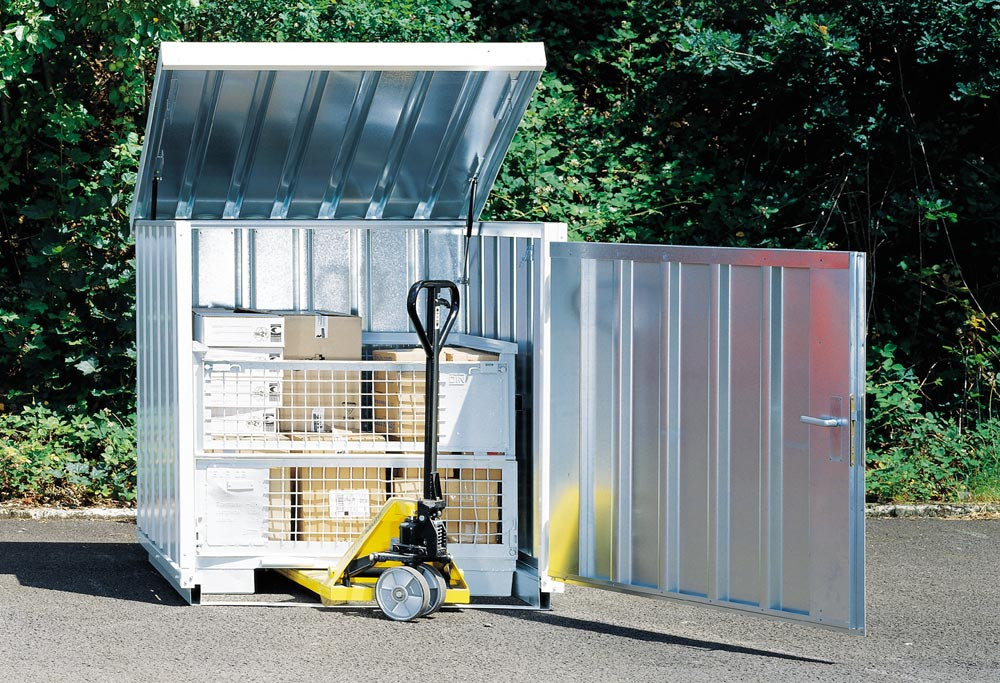 Materialbox aus Trapezblechen, verzinkt, mit Holzfußboden, mit hochstellbarem Dach, BxTxH 1430x1445x1475 mm