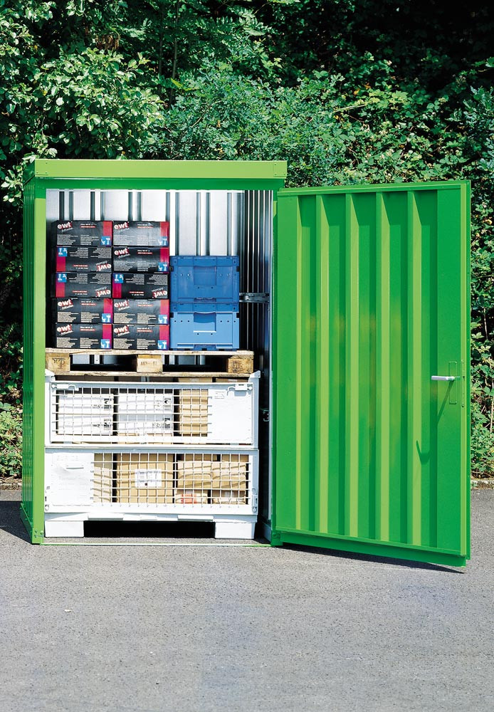 Materialbox aus Trapezblechen, verzinkt, ohne Fußboden, mit festem Dach, BxTxH 1410x1445x2130 mm