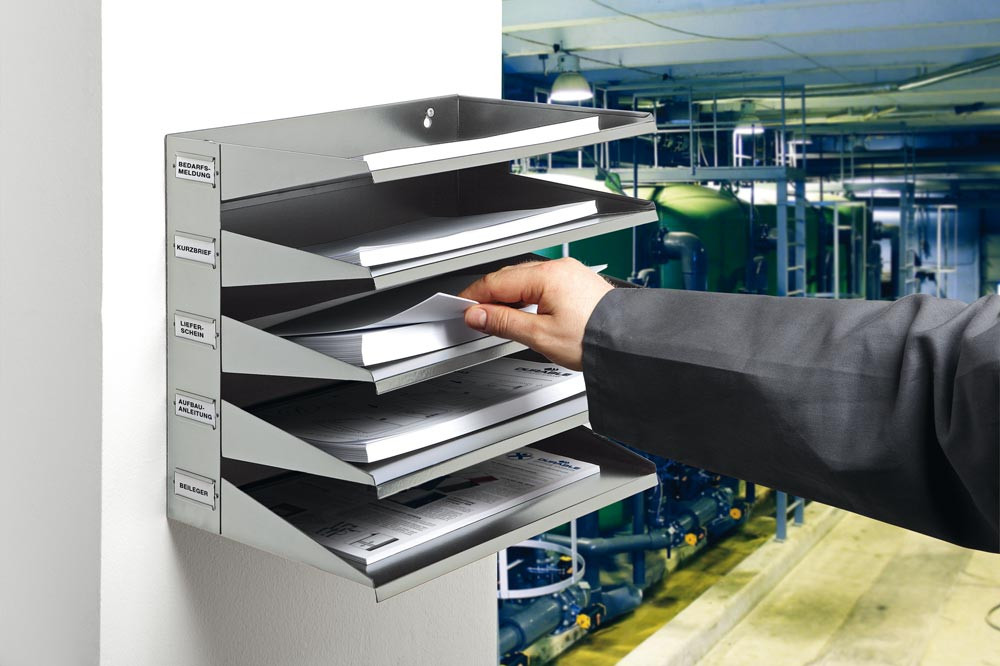 · Zum übersichtlichen Sortieren von Unterlagen · Für Fomate DIN A4 und Folio · Geeignet zum Stellen oder zur Wandbefestigung · Aus pulverbeschichtetem Stahl · Mit seitlichen Etikettenfenstern