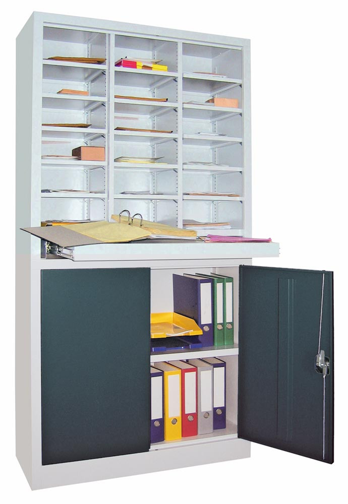 Ordnungsregal, BxTxH 1000x400x1950 mm, 3x6 Fächer, 1 Auszugboden, 1 Flügeltürenschrank 950 mm hoch mit 1 Boden, RAL 7035/7016 lichtgrau/anthrazit