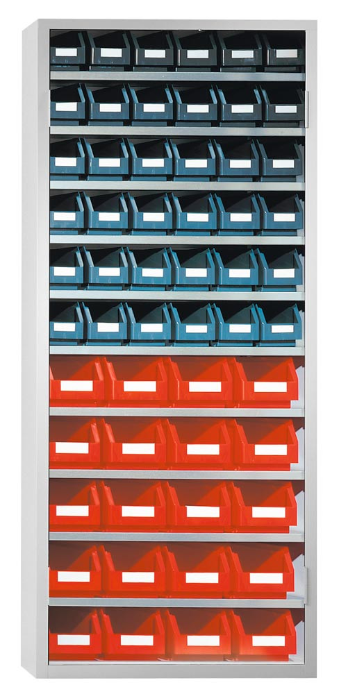 · Solide, innen und aussen schlag- und kratzfeste Stahlkonstruktion mit Kunststoffbeschichtung in RAL 7035 lichtgrau · Fachböden aus verzinktem Stahlblech, im Raster von 15 mm verstellbar · Tür-Öffnungswinkel über 180° · Dreiriegeliges Sicherheits-Zylinderschloss mit versenkbarem Drehgriff · Die Bestückung mit Sichtlagerkästen erfolgt je Größe und farblich sortiert