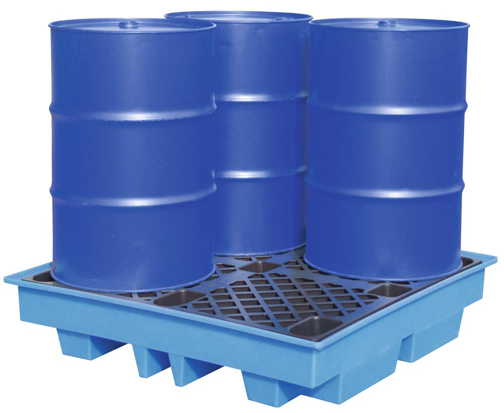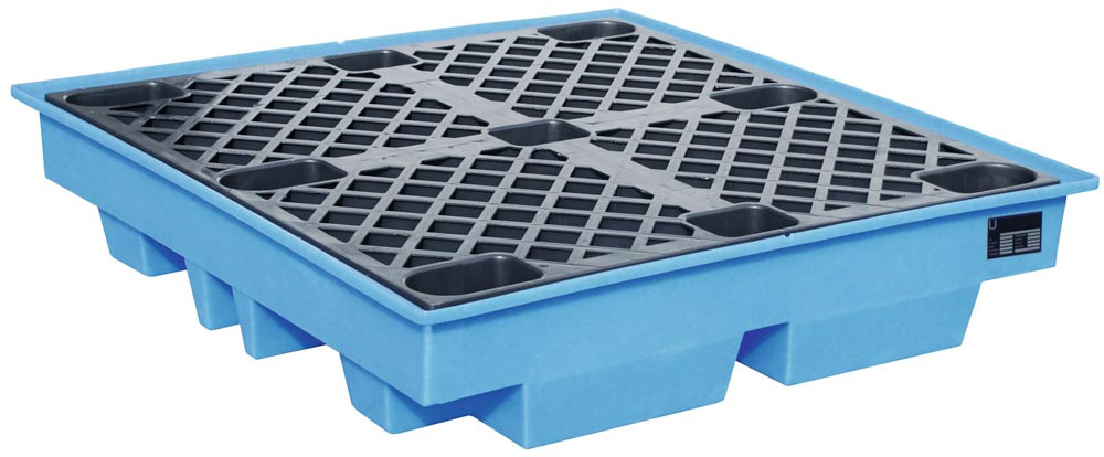 Polyethylen-Auffangwanne mit Einfahrtaschen und PE-Palette, BxTxH 1280x1280x275 mm, blau, Auffangvolumen 230 l, Gewicht 25 kg, Traglast 1250 kg