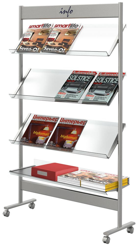Prospektregal aus Stahl, 4 Böden aus Acrylglas für 12 x DIN A4, BxTxH 710x350x1600 mm, fahrbar, alusilber E6041240
