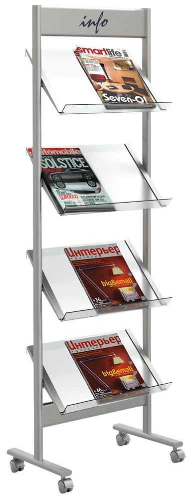 Prospektregal aus Stahl, 4 Böden aus Acrylglas für 12 x DIN A4, BxTxH 710x350x1600 mm, fahrbar, alusilber E6041240