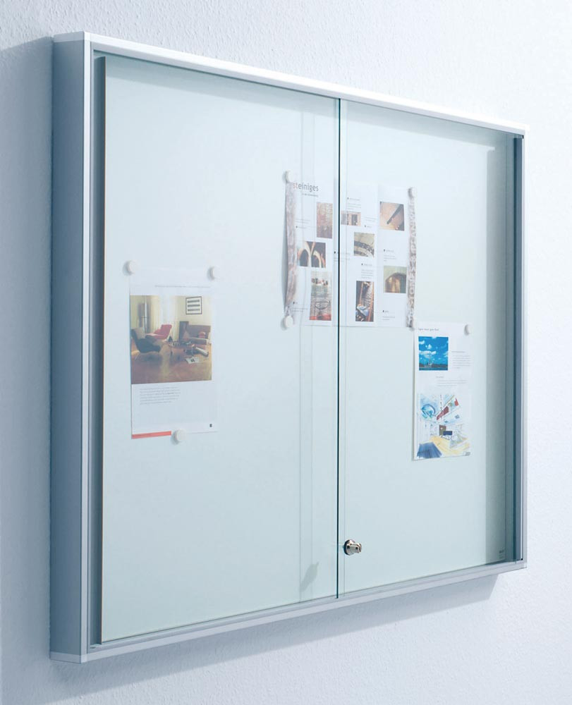 · Schaukästen mit verwindungssteifen Spezial-Alurahmen 15 mm breit · Profil eckig, mit Designkante · Schiebetüren aus Einscheibensicherheitsglas (ESG) mit seitlichem Griffstück · Sicherheits-Zylinderschloss · Magnetmetall-Rückwand verzinkt und RAL 9010 reinweiß beschichtet