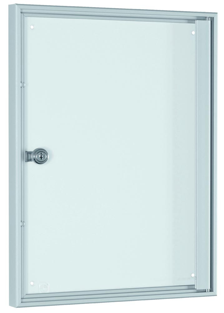 · Aus Aluminium-Profilen · Bautiefe 27 mm · Rückwand magnethaftend, Farbe grauweiß · Frontscheibe aus Einscheiben-Sicherheitsglas (ESG) · Öffnung mit Drehflügel seitlich nach rechts · Abschließbar · Entsprechen den Brandschutzbestimmungen B1 · Lieferung ohne Schriftleiste