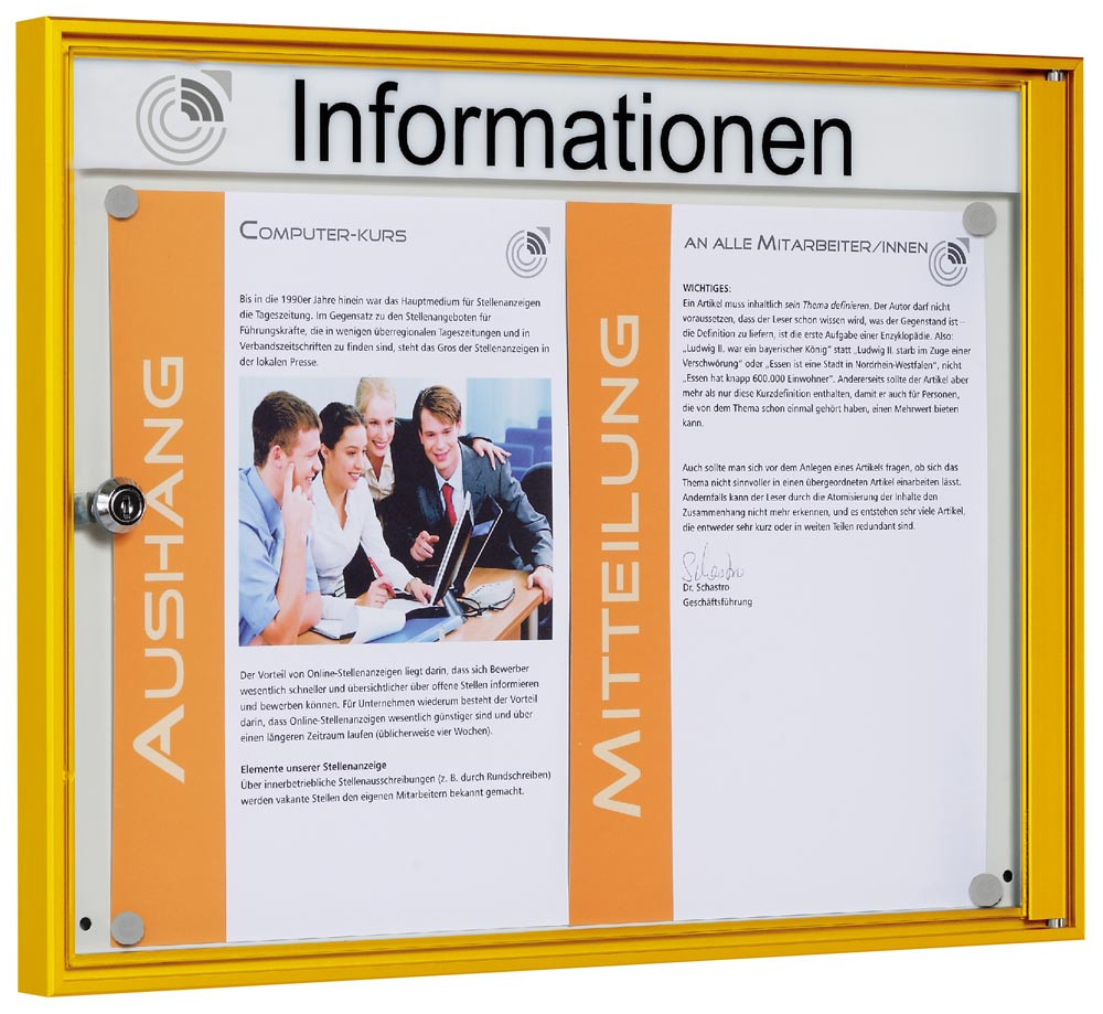 Schaukasten, BxTxH 500x27x380 mm, 2xDIN A4, Aluprofile gelb, ESG-Glas, Rückwand weiß, magneth.