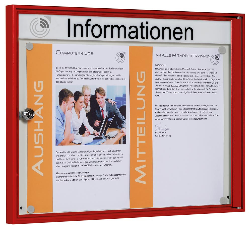 Schaukasten, BxTxH 500x27x380 mm, 2xDIN A4, Aluprofile rot, ESG-Glas, Rückwand weiß, magneth.
