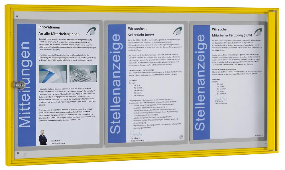 Schaukasten, BxTxH 725x27x380 mm, 3xDIN A4, Aluprofile gelb, ESG-Glas, Rückwand weiß, magneth.
