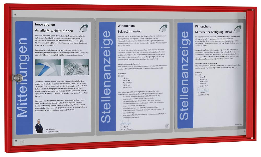 Schaukasten, BxTxH 725x27x380 mm, 3xDIN A4, Aluprofile rot, ESG-Glas, Rückwand weiß, magneth.
