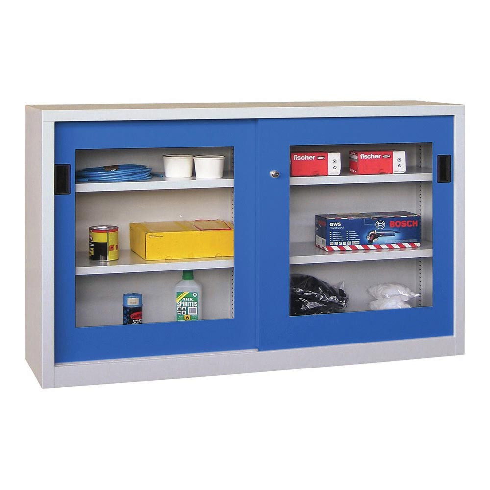 ∙ Korpus aus geschweißtem Stahlblech mit hochwertiger Pulverbeschichtung ∙ Türen mit Sichtfenster aus bruchsicherem Acrylglas (Schlagzähigkeit 15 kJ/m2), auf Spezialrollen im oberen Führungsprofil sicher geführt und mit Quetschschutz, auf Puffer aufschlagend ∙ Gemeinsam durch Drehdruckzylinder verschließbar, inkl. 2 Schlüsseln ∙ Serienmäßig verzinkte Fachböden, im Raster von 17 mm höhenverstellbar und mit 80 kg belastbar ∙ Gesamt-Belastbarkeit: Schränke ohne Trennwand 500 kg, mit Trennwand 600 kg (Traglastangaben verstehen sich bei gleichmäßig verteilter Last)