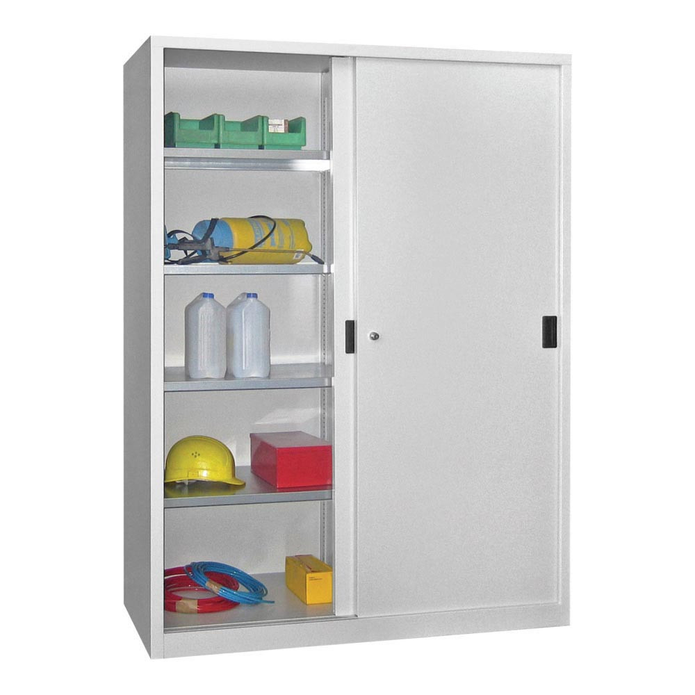 Schiebetürenschrank, Vollblechtüren, 8 verzinkte Böden, mit Trennwand, BxTxH 1500x500x1950 mm, RAL 7035