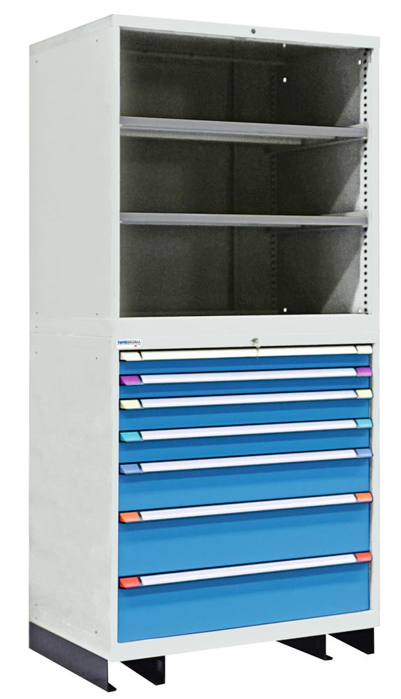 Schubladenregal, Grundfeld, 2 Verstellböden, 7 Schubladen, Traglast je 75 kg, Sockel, BxTxH 805x695x2100 mm, RAL 7035/5012 E6011349