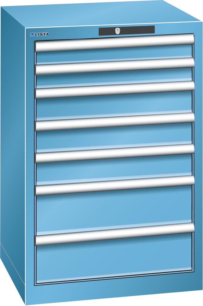 Schubladenschrank, Traglast/Schubl.: 75 kg, 7 Schubladen: 2x75, 3x100, 2x150 mm, RFID-Schloss, BxTxH 564x572x850 mm, RAL 5012 E6409496