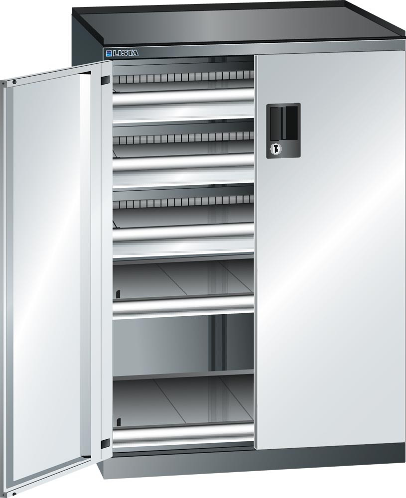 Schubladenschrank m. Flügeltüren, BxTxH 717x600x1020 mm, 3x75 Schubladen u. 2 Auszüge 200 kg, Schloss, RAL 5012