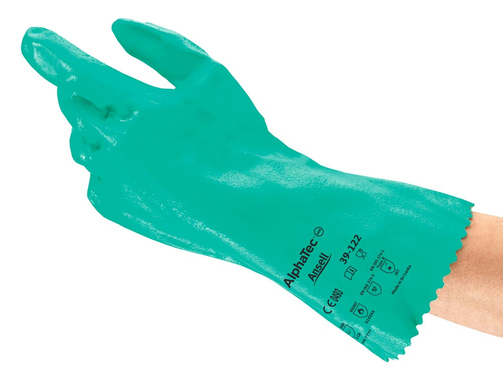 Gefahren-Kategorie III - Schutz gegen hohe Risiken ∙ Nach EN 374 und EN 388:2016 ∙ AQL 1,0 (EN 374) ∙ Nitril-Schutzhandschuh mit Interlock-Strickfutter aus Baumwolle ∙ Anatomisch geformter Handschuh mit optimalem Tragekomfort bei langwierigen Arbeiten ∙ Gute Beweglichkeit sowie ein sehr guter Nass- und Trockengriff ∙ Raue Ausführung ∙ Länge 310 mm ∙ Dicke 0,11 mm ∙ Farbe grün