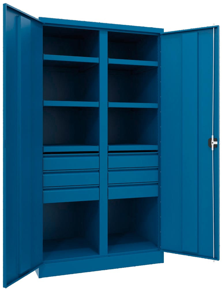 Schwerlastschrank, Vollblechtüren, m. Trennwand, 6 Böden, 200 kg Traglast, 4 Schubl. 175 mm, BxTxH 1040x630x1950 mm, RAL 5010 E6490079