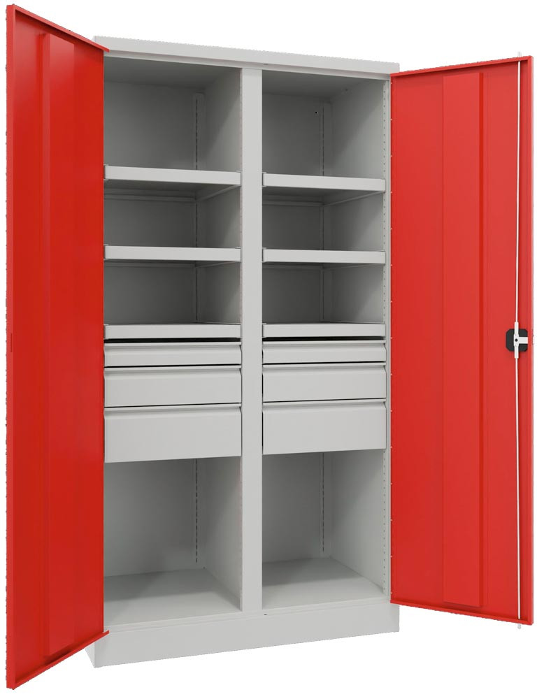 Schwerlastschrank, Vollblechtüren, m. Trennwand, 6 Böden, 200 kg Traglast, 4 Schubl. 175 mm, BxTxH 1040x630x1950 mm, RAL 5010 E6490079