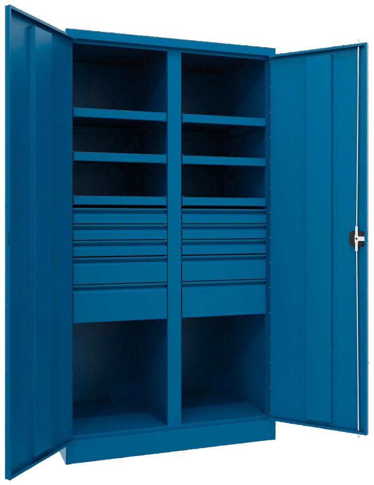 Schwerlastschrank, Vollblechtüren, m. Trennwand, 6 Böden, 200 kg Traglast, 4 Schubl. 175 mm, BxTxH 1040x630x1950 mm, RAL 5010 E6490079