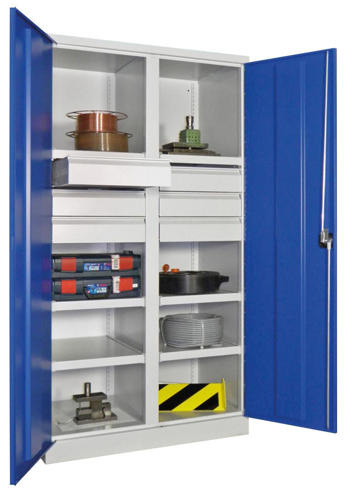 Schwerlastschrank, Vollblechtüren, mit Trennwand, 6 beschichtete Böden, 6 Schubl. 175 mm, BxTxH 1040x630x1950 mm, RAL 5010 E1572917