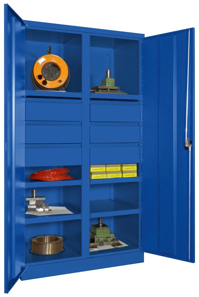 Schwerlastschrank, Vollblechtüren, mit Trennwand, 6 beschichtete Böden, 6 Schubl. 175 mm, BxTxH 1040x630x1950 mm, RAL 5010 E1572917
