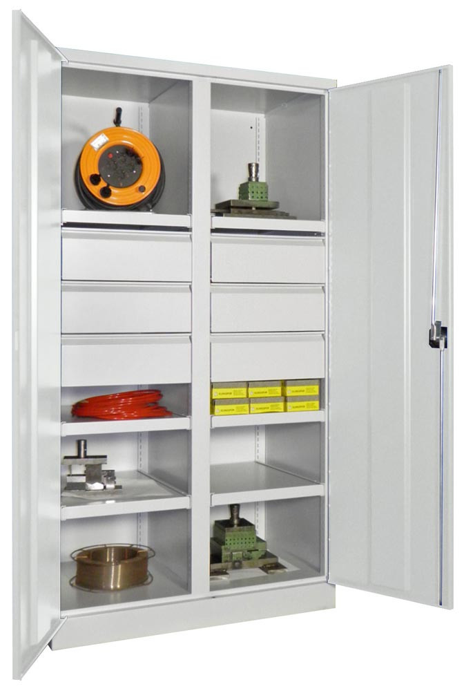 Schwerlastschrank, Vollblechtüren, mit Trennwand, 6 beschichtete Böden, 6 Schubl. 175 mm, BxTxH 1040x630x1950 mm, RAL 7035