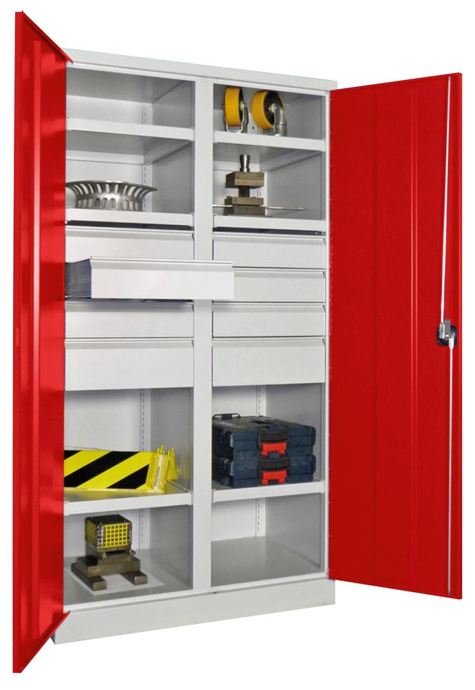 ∙ Besonders stabile, verwindungssteife Stahlblechkonstruktion ∙ Oberfläche pulverbeschichtet ∙ Schränke mit gemeinsam verschließbaren Flügeltüren mit Verstärkungstaschen ∙ Die Türen sind über einen dreiriegeligen Drehgriff mit integriertem Zylinderschloss inkl. 2 Schlüsseln verschließbar ∙ Türöffnung 180 ° ∙ Belastbarkeit je Boden 120 kg bzw. 200 kg, je Schublade 60 kg bei gleichmäßig verteilter Last ∙ Gehäuse-Belastbarkeit 1300 kg ∙ Einrichtungselemente im Raster von