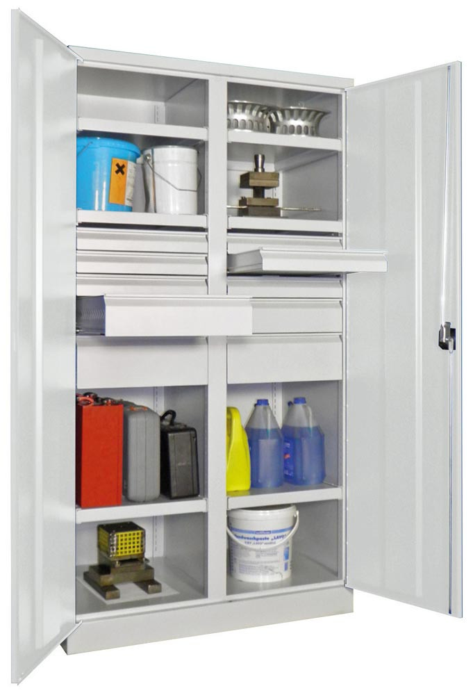 ∙ Besonders stabile, verwindungssteife Stahlblechkonstruktion ∙ Oberfläche pulverbeschichtet ∙ Schränke mit gemeinsam verschließbaren Flügeltüren mit Verstärkungstaschen ∙ Die Türen sind über einen dreiriegeligen Drehgriff mit integriertem Zylinderschloss inkl. 2 Schlüsseln verschließbar ∙ Türöffnung 180 ° ∙ Belastbarkeit je Boden 120 kg bzw. 200 kg, je Schublade 60 kg bei gleichmäßig verteilter Last ∙ Gehäuse-Belastbarkeit 1300 kg ∙ Einrichtungselemente im Raster von