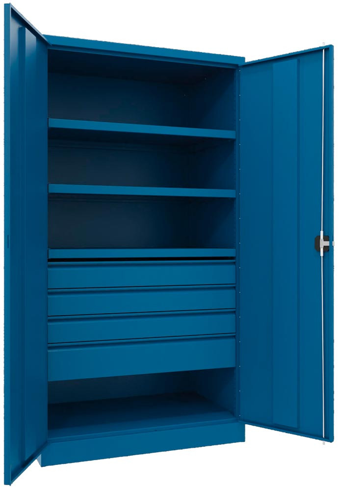 Schwerlastschrank, Vollblechtüren, ohne Trennwand, 3 Böden, 200 kg Traglast, 2 Schubl. 175 mm, BxTxH 1040x630x1950 mm, RAL 5010 E6490150