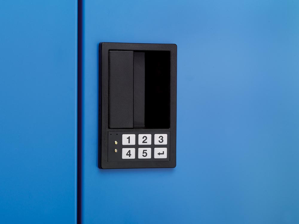 Schwerlastschrank mit Sichtfensterflügeltüren, elektr. Zahlenschloss, BxTxH 1100x641x1950 mm, RAL 5012 E1615232