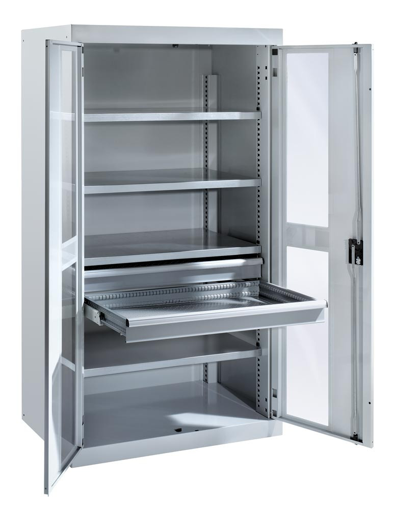 Schwerlastschrank, Sichtfenstertüren, Zylinderschloss, BxTxH 1100x641x1950 mm, RAL 7035 E1615233