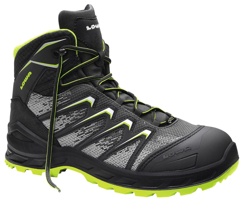 Nach EN ISO 20345, Sicherheitsklasse S3 CI HI HRO SRC, Form B ∙ Mit Stahlkappe ∙ Metallfreier Durchtrittschutz ∙ Obermaterial aus hydrophobiertem Textilmaterial ∙ Innenfutter aus GORE-TEX® Performance Comfort Footwear ∙ Geschlossene, gepolsterte Lasche ∙ Ganzflächige Einlegesohle LOWA ∙ Gummi/PU Laufsohle LARROX Work mit MONOWRAP® Technologie ∙ TPU Überkappe ∙ Lederfreie Ausstattung ∙ Farbe grau/grün