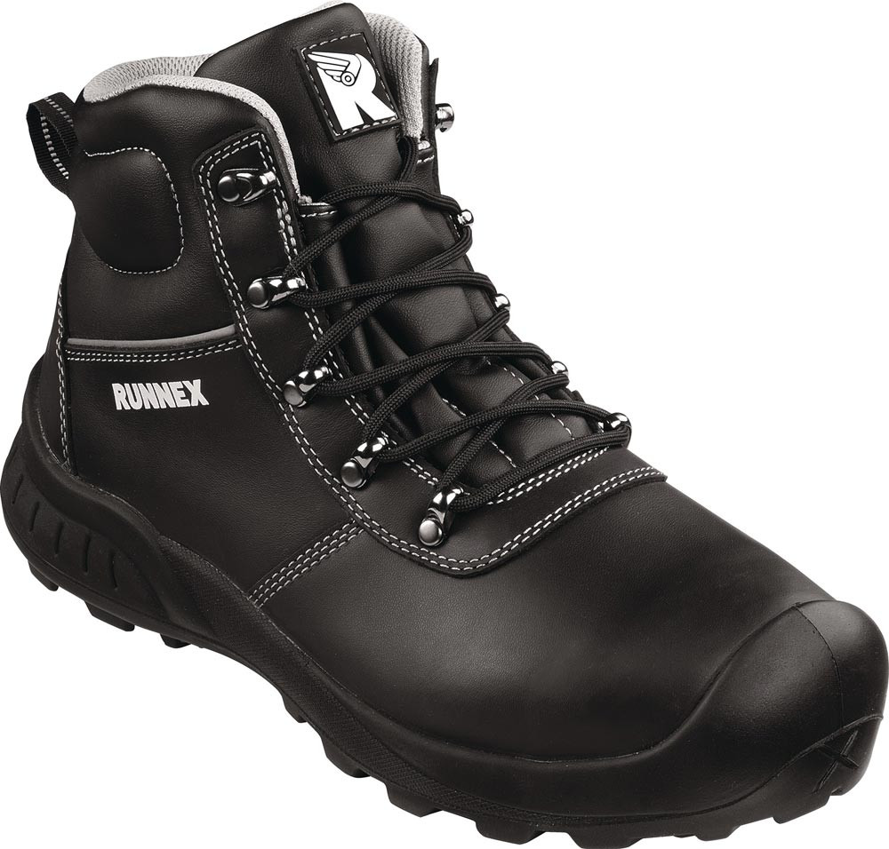 Nach EN ISO 20345, Sicherheitsklasse S3 SRC ∙ RUNNEX® Alu-Protection, Zehenschutzkappe aus Aluminium ∙ Metallfreie Durchtritthemmung ∙ Obermaterial: Hydrophobiertes Glattleder ∙ Geschlossene, gepolsterte Lasche ∙ Gepolsterte Ferse und Schaftabschluss ∙ Reflektierende Biese ∙ 2-Dichten PU/PU-Sohle, Rutschhemmung SRC ∙ RUNNEX® EVA-Dämpfungssystem ∙ Ganzflächige Einlegesohle aus Poliyou® ∙ Überkappe aus Polyurethan ∙ Zertifiziert für orthopädische Einlegesohlen nach DGUV Regel 112-191 ∙ Farbe schwarz/grau