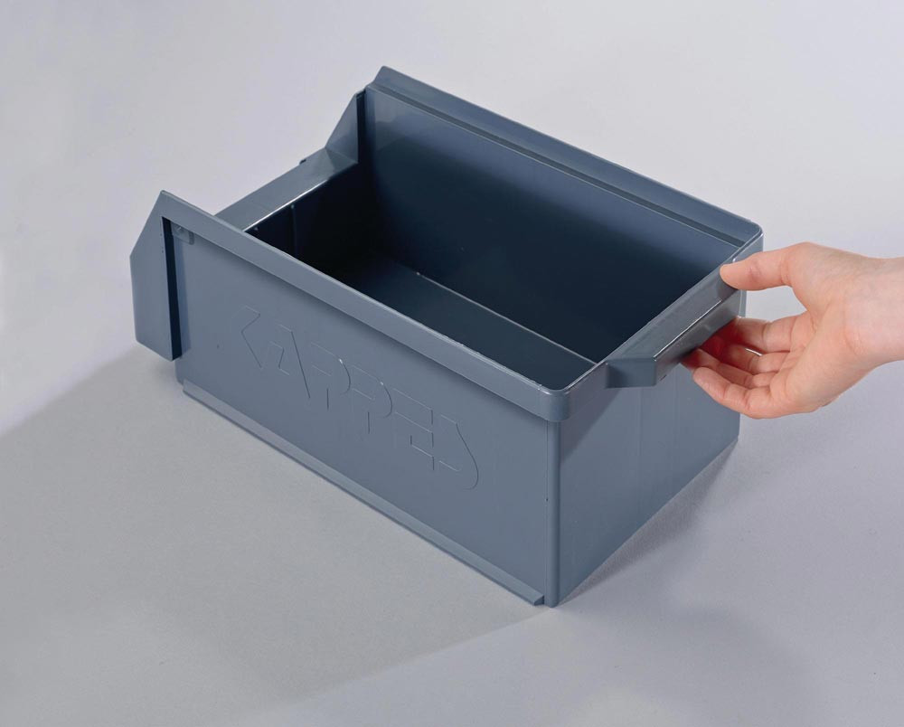 aus schlag- und stoßfestem Polyethylen · temperaturbeständig von - 40 °C bis + 80 °C · Rippenverstärkung an den Bodenrändern · geeignet für Förder - und Röllchenbahnen · beständig gegen Säuren, Öle und Laugen · lebensmittecht · einfaches waagerechtes An- und Abhängen des Kastens auch im befüllten Zustand · Lieferung erfolgt ohne Etiketten