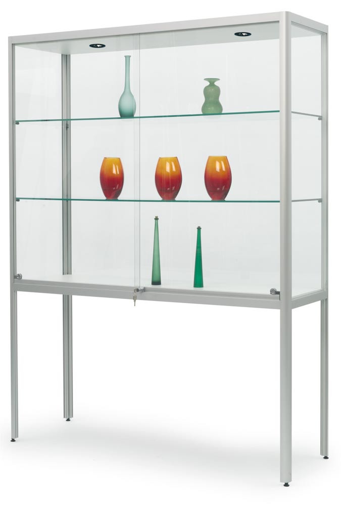 ∙ Sehr stabile Rahmenkonstruktion aus Alu-Spezialprofilen, silberfarbig eloxiert ∙ Boden und Deckel aus Möbelplatte ∙ Außenverglasung aus ESG-Sicherheitsglas ∙ Sicherheitsschloss mit 2 Schlüsseln ∙ Höhenverstellbare Fachböden aus ESG-Sicherheitsglas