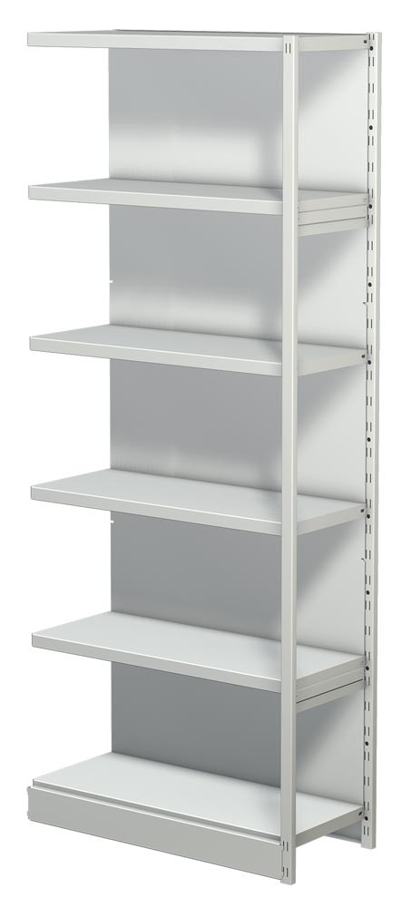 ∙ Optimale Raumausnutzung ∙ Fachböden 30 mm stark, im Raster von 59 mm höhenverstellbar ∙ Regalpfosten aus Kastenprofilen mit glatten Fronten ∙ Serienmäßig mit bodenbündiger Sockelblende ∙ Mit zusätzlichen Fachböden, Fachteilern, Seiten- und Trennstegen und Pendelhefterschienen individuell auszustatten ∙ Türen-Anbausätze, Seitenblenden und Zwischenwände ermöglichen die problemlose Integration von Schrankelementen ∙ Hochwertige Pulverbeschichtung in RAL 7035 lichtgrau