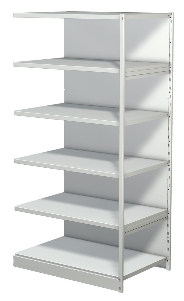 ∙ Optimale Raumausnutzung ∙ Fachböden 30 mm stark, im Raster von 59 mm höhenverstellbar ∙ Regalpfosten aus Kastenprofilen mit glatten Fronten ∙ Serienmäßig mit bodenbündiger Sockelblende ∙ Mit zusätzlichen Fachböden, Fachteilern, Seiten- und Trennstegen und Pendelhefterschienen individuell auszustatten ∙ Türen-Anbausätze, Seitenblenden und Zwischenwände ermöglichen die problemlose Integration von Schrankelementen ∙ Hochwertige Pulverbeschichtung in RAL 7035 lichtgrau