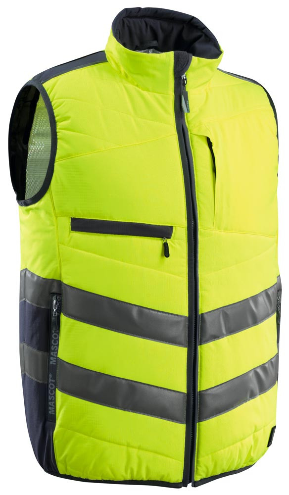 Nach EN ISO 20471 - Klasse 1 und Hi-Vis Gruppe C ∙ Aus 100% Polyester, ca. 365 g/m2 ∙ Zweifarbig ∙ Atmungsaktiv, winddicht und wasserabweisend ∙ Wattiert mit Polyesterfüllung ∙ Verschluss mit Reißverschluss und inwendiger Wetterschutzleiste ∙ Stehkragen ∙ Reißverschlussinnentasche speziell für Handys entwickelt, mit Öffnung sowie Schlaufen für das Kopfhörerkabel ∙ Brusttaschen mit Reißverschluss ∙ D-Ring ∙ Vordertaschen mit Reißverschluss ∙ Für Industriewäsche-Kategorie B3 geeignet ∙ Zertifiziert nach OEKO-TEX® Standard 100