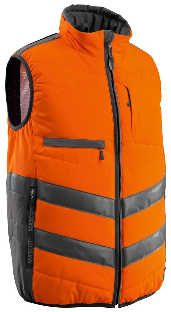 Nach EN ISO 20471 - Klasse 1 und Hi-Vis Gruppe C ∙ Aus 100% Polyester, ca. 365 g/m2 ∙ Zweifarbig ∙ Atmungsaktiv, winddicht und wasserabweisend ∙ Wattiert mit Polyesterfüllung ∙ Verschluss mit Reißverschluss und inwendiger Wetterschutzleiste ∙ Stehkragen ∙ Reißverschlussinnentasche speziell für Handys entwickelt, mit Öffnung sowie Schlaufen für das Kopfhörerkabel ∙ Brusttaschen mit Reißverschluss ∙ D-Ring ∙ Vordertaschen mit Reißverschluss ∙ Für Industriewäsche-Kategorie B3 geeignet ∙ Zertifiziert nach OEKO-TEX® Standard 100