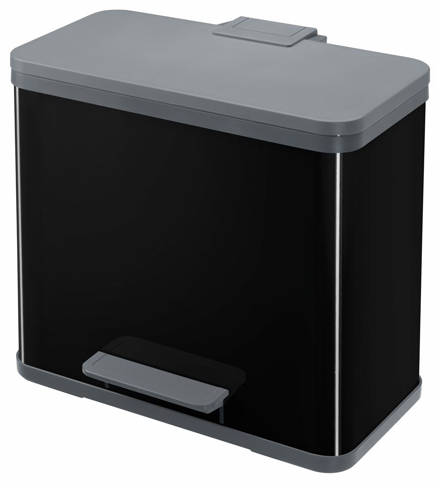∙ Rechteck-Gehäuse mit einzelnen Inneneimern zur Mülltrennung ∙ Stabil und standfest ∙ Deckel aus hochwertigem Kunststoff in schwarz mit Vertiefung zur Kennzeichnung der Abfallsortierung, inkl. Farbsticker zur Müllsorten-Kennzeichnung · Gedämpfter Deckel-Schließ-Mechanismus - Deckel schließt leise · Großer Öffnungswinkel zum leichten Befüllen · Ergonomischer Tragegriff im Deckelscharnier integriert · Ergonomisch breites Fußpedal · Innenliegende, hygienische Tretmechanik · Standfest durch breiten Bodenring