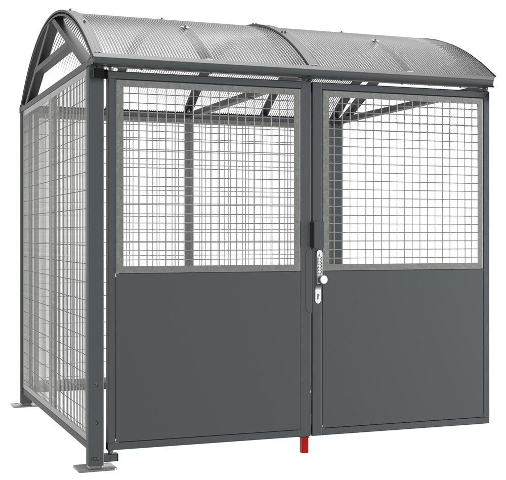 · Für das sichere Parken von Fahrrädern, Rollern, und Motorrädern · Robuste Stahlpfosten sowie das feuerverzinkte Stahlgitter für eine effektive und langlebige Lösung, um das Risiko des Diebstahls von Zweirädern zu verringern · Gestell aus Stahlposten 80 x 80 mm, beschichtet in grau, Dach aus Stahlträger 60 x 40 mm, Regenrinne aus Aluminium · Bogendach aus durchsichtigem Poycarbonat, Stärke 10 mm, mit UV-Schutz · Bogendach seitlich verstärkt gegen Diebstahl und Vandalismus · Stahlgitter feuerverzinkt · Seiten- und Rückwandverkleidungen aus Stahlgitter Ø 5 mm, auf Stahlrahmen geschweißt · Doppeltüre: Oberer Teil aus Stahlgitter Ø 5 mm, unterer Teil aus Stahlblech, 1,5 mm stark · Öffnung von Innen auch ohne Schlüssel möglich · Sicherung der Türposition durch Riegel · Montage erfolgt auf Bodenplatten, Spreizdübel inbegriffen, Pfosten höhenverstellbar