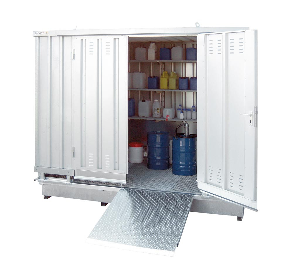∙ Robuste und verzinkte Stahlblechkonstruktion inkl. Kranösen und Doppelflügeltüren ∙ Feuerverzinkte Auffangwannen mit Gitterrost, max. Traglast 1000 kg/qm bei verteilter Last