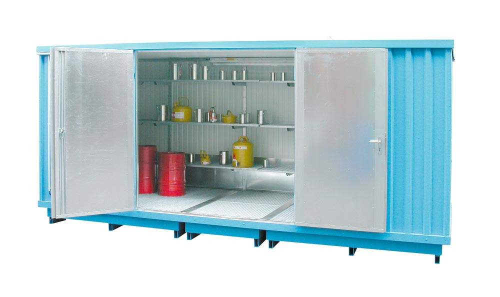 ∙ Robuste und verzinkte Stahlblechkonstruktion inkl. Kranösen und Doppelflügeltüren ∙ Feuerverzinkte Auffangwannen mit Gitterrost, max. Traglast 1000 kg/qm bei verteilter Last